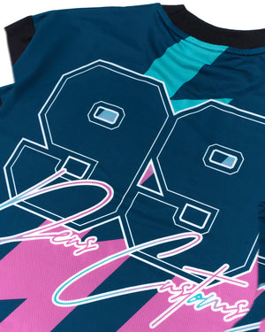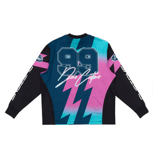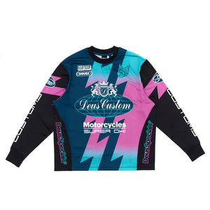 Moto jersey crafted from soft lightweight closed mesh, printed with custom Deus Ex Machina logo art, full sublimation print, midweight rib on neck and sleeve cuff, polyester elastane.