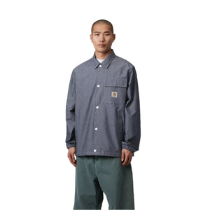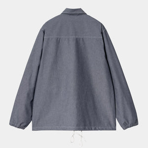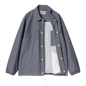 The Blake Coach Jacket is made from polycotton chambray, a lightweight fabric with denim-like qualities. A sportswear-inspired item, the jacket is lined with mesh and has a snap-button front, elasticated cuffs, and an adjustable drawstring bottom band. The jacket is also detailed with subtle contrast stitching. Two welt pockets appear on the sides. A woven Square Label appears on the chest pocket.