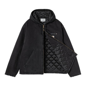 The Cleveland Jacket is made from a heavyweight cotton denim with a diamond-quilted nylon lining. It features an adjustable hood and a two-way zip closure. A zipped chest pocket, an interior chest pocket and a kangaroo pocket offer functional details, while bartack stitching at vital stress points provides additional durability. A woven Square Label appears on the chest.