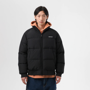 The Nebraska Jacket is made from lightweight poly-cotton fabric which has been padded with artificial down for warmth. The jacket also has water-repellent qualities for inclement weather. A rib-knit collar, bottom band, and cuffs offer a cinching, insulating fit. An embroidered Script Logo appears on the chest.