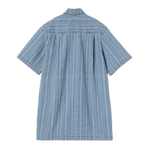 The Women's Dress is made from heavyweight cotton denim featuring allover stripes. Based on a chore coat silhouette, the dress features four front pockets, one of which has a flap and button closure. Bartack stitching at vital stress points offer added reinforcement. A woven Square Label completes the design.