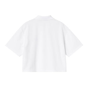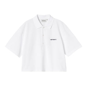 The Women's S/S Carhartt Script Polo T-Shirt is made from midweight cotton piqué in a loose, cropped fit. An embroidered Script Logo appears on the chest.