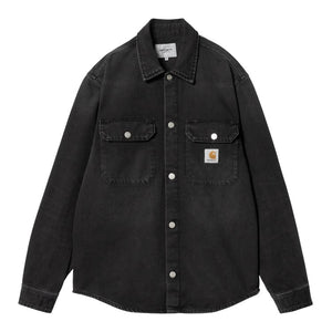 The Harvey Shirt Jacket is constructed from heavyweight cotton denim and is unlined. The item comes in a dark used wash version for a saturated yet worn-in finish, and a stone-bleached iteration for a lighter appearance. Two flap and button pockets appear on the front. A woven Square Label completes the design.
