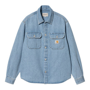 The Harvey Shirt Jacket is constructed from heavyweight cotton denim and is unlined. The item comes in a dark used wash version for a saturated yet worn-in finish, and a stone-bleached iteration for a lighter appearance. Two flap and button pockets appear on the front. A woven Square Label completes the design.