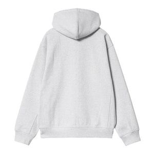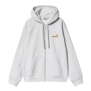 The Hooded American Script Jacket is made in a loose fit from heavyweight, brushed polycotton jersey, giving it a fleece-like backing. It features an adjustable hood, a zip front closure, and a split kangaroo pocket. Two-tone American Script embroidery appears on the chest.