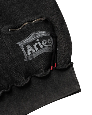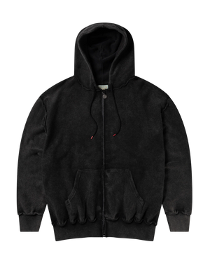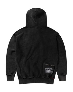 Zip-through hooded sweatshirt made in reverse side loop back jersey, featuring a 2-way Roman Coin zip and 'Aries Ancient Temple' screen print on the back zip pocket, finished with a heavy wash treatment for an aged look.