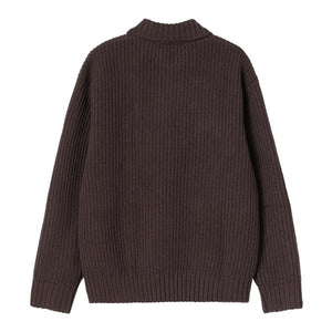 The Chore Knit Jacket is made from a blend of acrylic, wool, and nylon yarn. The style is inspired by the silhouette of a classic chore coat and features four patch pockets on the front, one of which has a buttoned flap. A woven Square Label completes the design.
