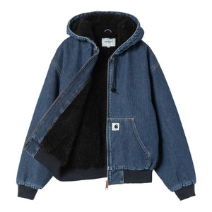 The Women's OG Active Jacket is constructed in our original loose fit from Smith denim, which is a heavyweight cotton fabric that has been stone-washed for a softer feel and lightly worn-in appearance. It also features a tactile pile lining and has diamond-quilted sleeves for additional warmth. A kangaroo pocket and adjustable hood offer functional touches, while triple-stitch details provide extra durability.