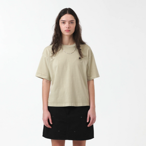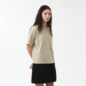 The Women's S/S Nelson T-Shirt is made from lightweight cotton jersey in a loose fit with a cropped silhouette. The item has also been garment-dyed for a softer feel and more complex color configuration. A woven Square Label, rendered murky by the dyeing process, appears on the left chest.